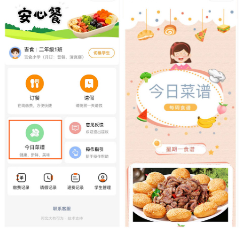 添加好學生(shēng)信息後并選擇學生(shēng)進入,還(hái)可(kě)在該頁面切換學生(shēng),點擊訂餐進入訂餐繳費頁面,直接繳費。